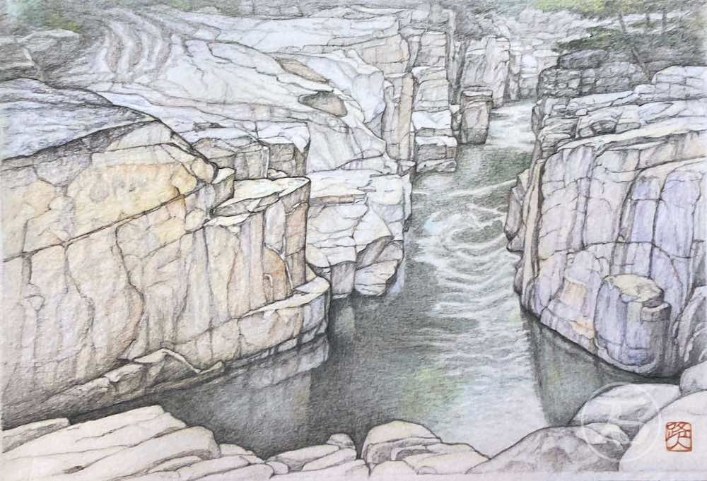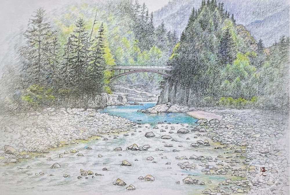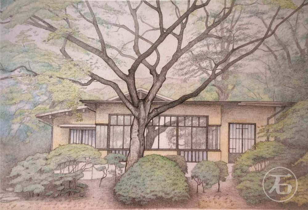 京都府大山崎町 制作年2023 B4 藤井厚二(建築家、1888(月月治21年生)~1938(日和33年)49才) 日本人の理想の住まいを目指して、生涯5棟てる。 最近の5棟目がこの「聴竹居」です。凝ったつくりの緑側の前に もみじの大木があり、低い木は どうだんつつじが植えられて建物との調和がすばらしい。…